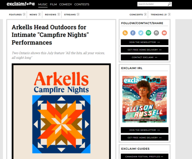 Before turning attention to their Laundry Pile, Arkells will head outdoors this summer for a pair of intimate performances in the spirit of their Campfire Chords.