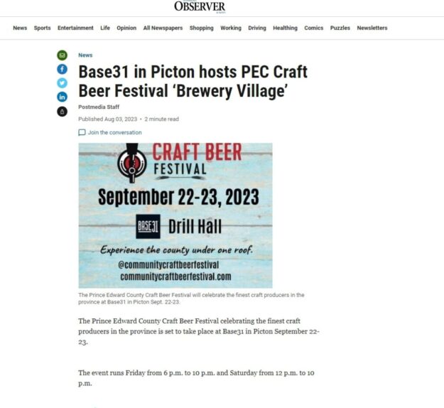 The Prince Edward County Craft Beer Festival will celebrate the finest craft producers in the province at Base31 in Picton Sept. 22-23.