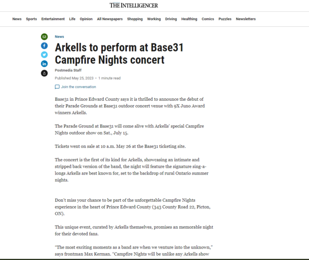 Base31 in Prince Edward County says it is thrilled to announce the debut of their Parade Grounds at Base31 outdoor concert venue with 9X Juno Award winners Arkells.