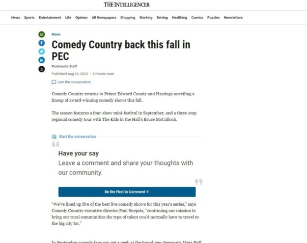 Comedy Country returns to Prince Edward County and Hastings unveiling a lineup of award-winning comedy shows this fall.