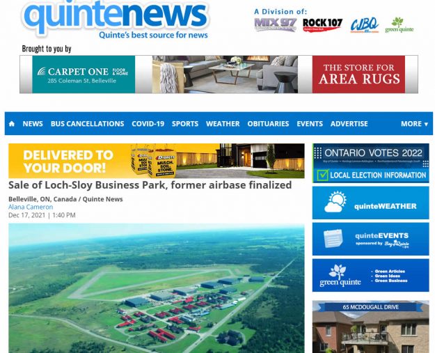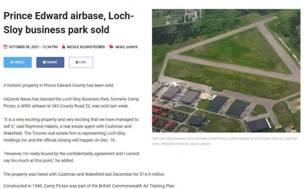 InQuinte News has learned the Loch-Sloy Business Park, formerly Camp Picton, a WWII airbase at 343 County Road 22, was sold last week.