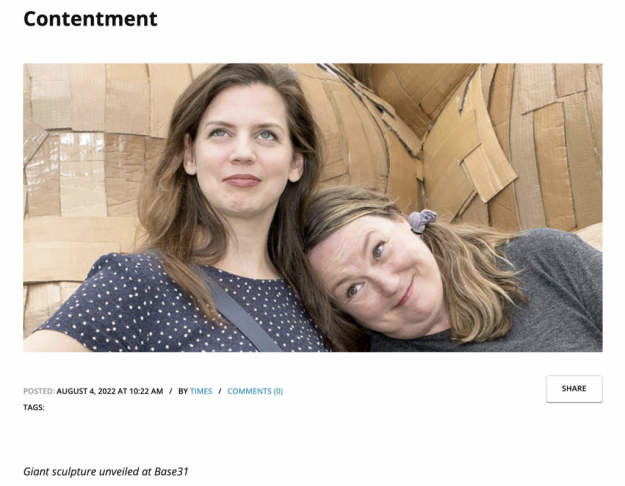 Laurence Vallières and Krista Dalby mimic the pose of the giant cardboard birds sculpture now on display adjacent to Melt Studio and Gallery at Base31.
