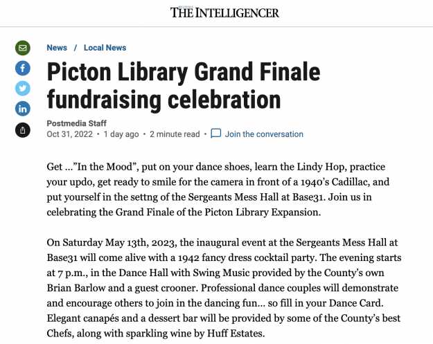 Mark your calendars and show your support for the Picton Library Expansion Fundraising Gala. Get …”In the Mood”, put on your dance shoes, learn the Lindy Hop, practice your updo,…